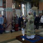 Затем Правящий Архиерей в сослужении духовенства собора возгласил положенные молитвы и окропил принесенную богомольцами пасхальную снедь святой водой.